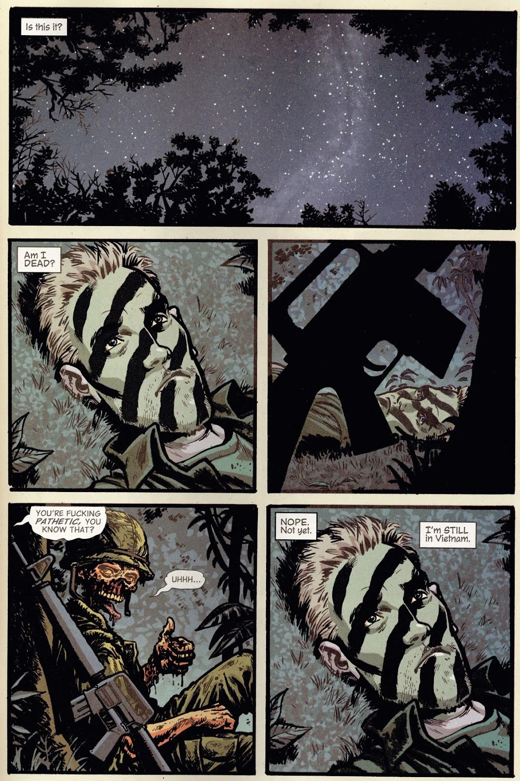 “A war comic without heroism…Aaron's script and Stewart's crisp, impressionistic artwork (convincingly evoking the landscapes of the country and jungle, and colored in a palette that's mostly bloody reds and rotting greens) revolve around contrasts and reflections. But the title isn't just a reference to the opposing army: it suggests the way each of its protagonists is transformed, and loses his humanity by the process of being trained to kill.” — Publisher’s Weekly